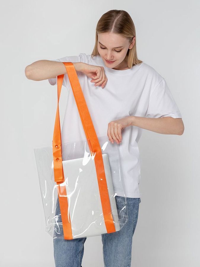 Прозрачные сумки никогда не выйдут из моды. А цветные ручки легко впишутся в брендбук и точно передадут настроение, которое хотелось бы транслировать.