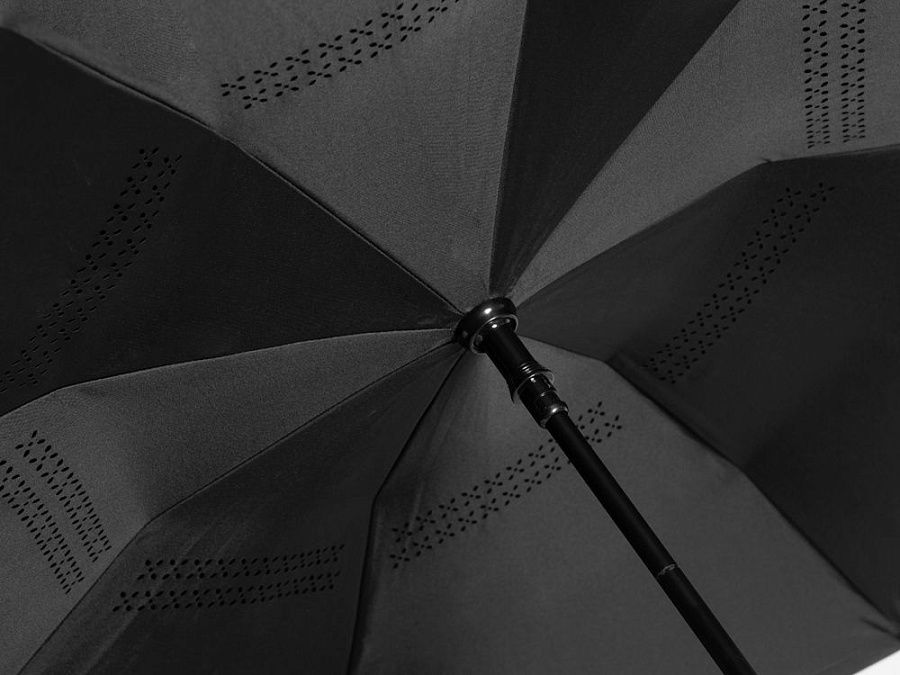 Зонт с обратным сложением складывается "внутрь". Очень удобен в использовании, например, во время посадки в машину при складывании вода остается внутри купола. Для просушки зонт можно поставить вертикально на пол в сложенном виде, что позволяет воде стекать без раскрытия зонта. Двойной купол из 190Т эпонжа. Ручка с мягким покрытием soft-touch для большего комфорта.