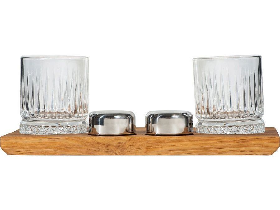 деревянная подставка 28,5 х 12,9 х 2,1 см, бокал 210 мл- 2 шт, шайба для виски d5 х 2,8 см- 2 шт, упаковочная коробка