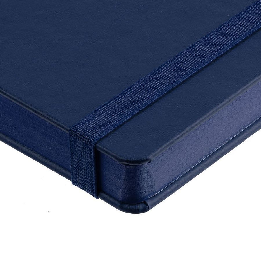 Ежедневник с твердой обложкой, выполнен из материала Latte, темно-синий ХХ, обрез темно-синего цвета, дополнен ляссе темно-синего цвета и резинкой с металлическим шильдом.
