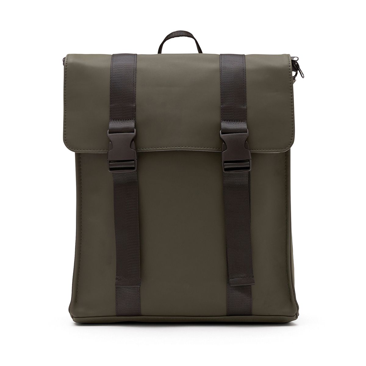 Рюкзак изготовлен из приятного на ощупь водоотталкивающего полиуретана с покрытием soft-touch. Он не боится дождя, брызг и легко очищается. У рюкзака два внутренних отделения: основное и дополнительное, для ноутбука или планшета, с мягкой подкладкой и ремнем на застежке-липучке. Телефон, наушники или другие мелочи можно расположить в трех карманах, один из которых — внутри. Все карманы застегиваются на молнии. Снаружи рюкзак дополнительно фиксируется застежками. Лямки, также изготовленные из полиуретана, можно отрегулировать по длине.
