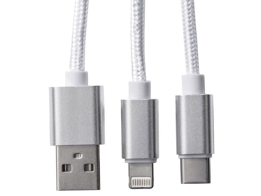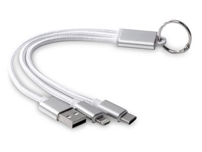 Кабель для зарядки «Tres» 3-в-1 с брелоком, коннекторами 1 type с, 1 USB type A и двойным совместимым коннектором «2-в-1» для устройств с ОС Apple® iOS и Android. В комплект входит брелок. Для зарядки устройств Apple подключайте кабель стороной без контактов; для зарядки устройств с ОС Android подключайте кабель стороной с контактами. Алюминий.