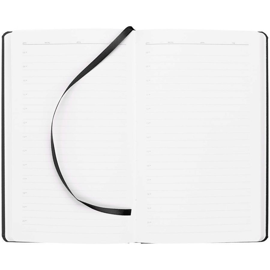 Ежедневник с твердой обложкой, выполнен из материала Canyon, черный АА, дополнен ляссе в цвет обложки.