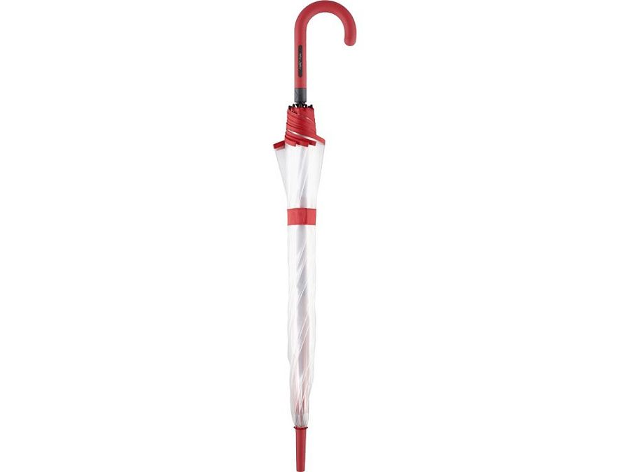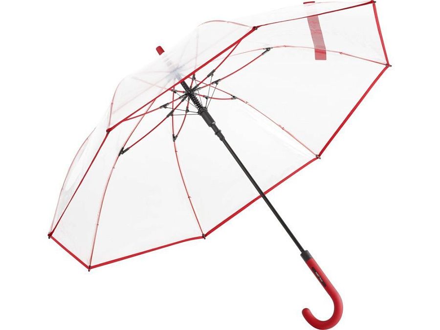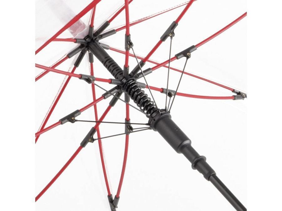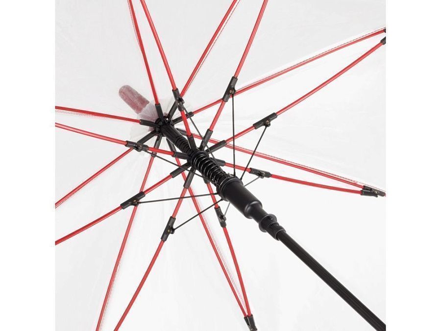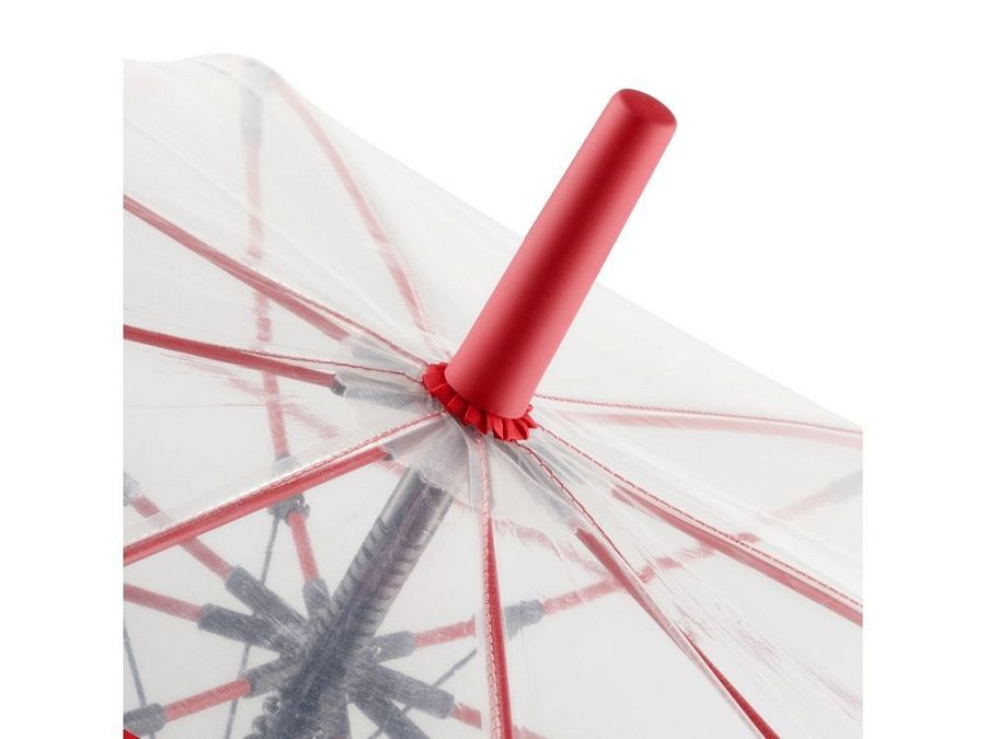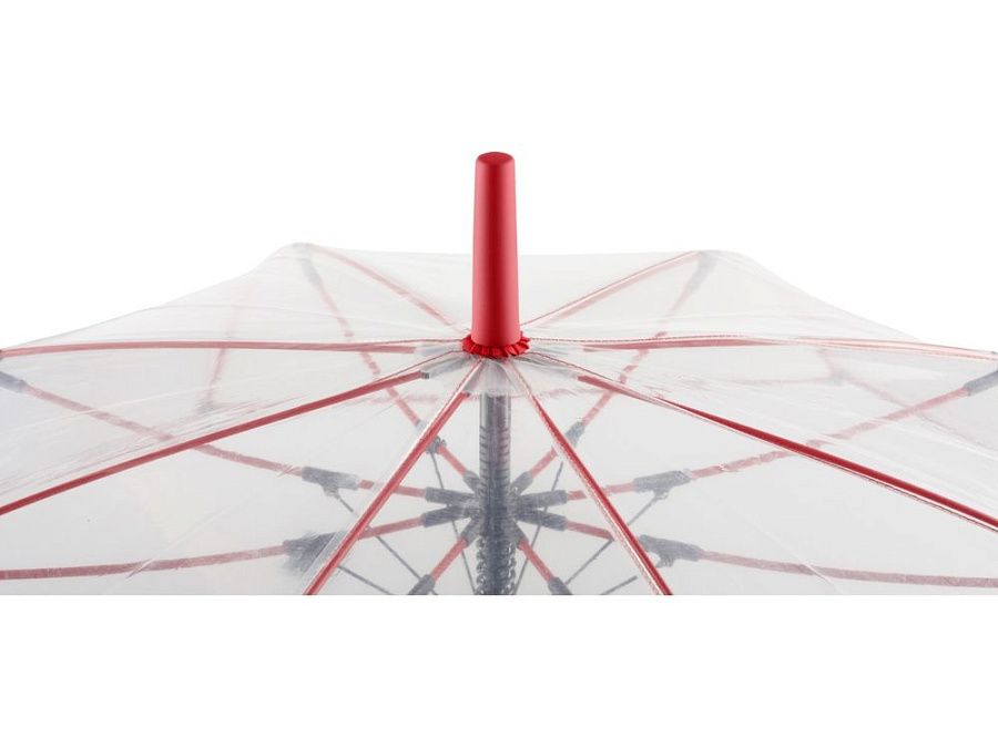 Зонт-трость с прозрачным куполом и контрастными деталями легко открывается нажатием кнопки на ручке. Каркас выполнен из прочной долговечной гальванизированной стали. Благодаря гибким спицам из стекловолокна зонту не страшны порывы ветра.