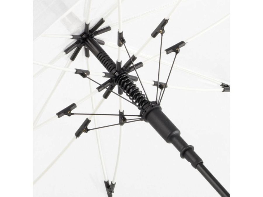 Зонт-трость с прозрачным куполом и контрастными деталями легко открывается нажатием кнопки на ручке. Каркас выполнен из прочной долговечной гальванизированной стали. Благодаря гибким спицам из стекловолокна зонту не страшны порывы ветра.