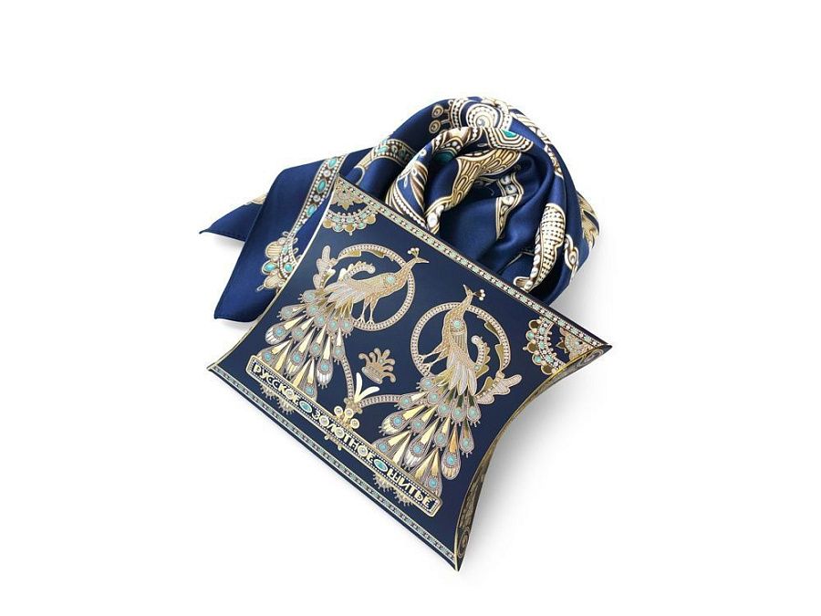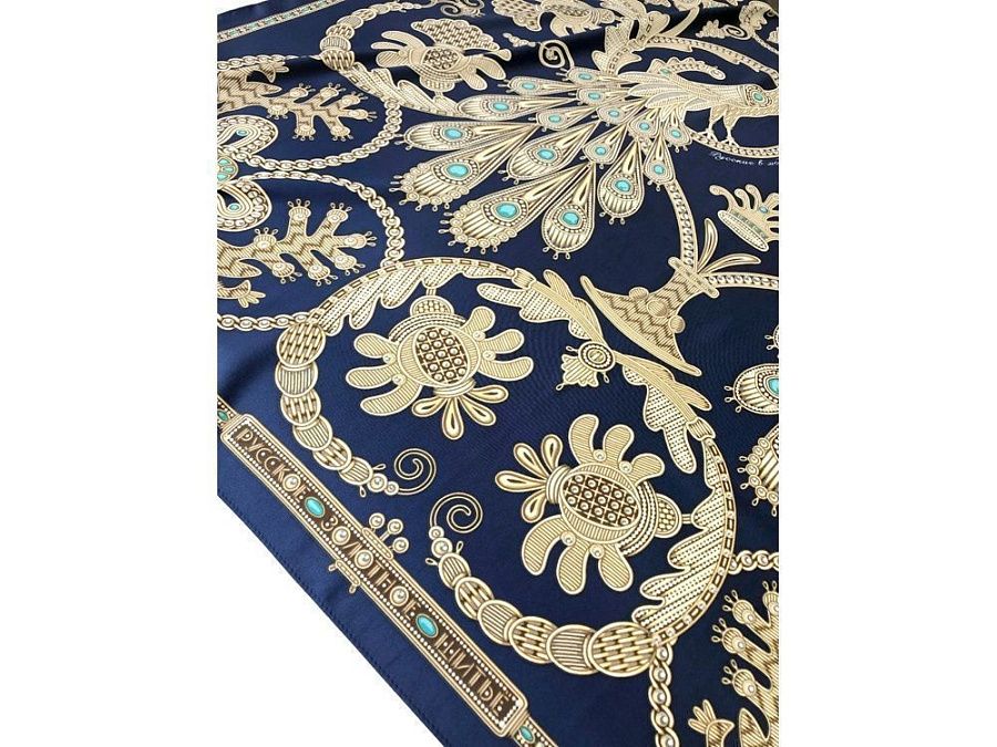 Платок «Русское золотное шитьё» посвящён драгоценному старинному русскому рукоделию. Дошедшие до нас памятники шитья, выполненные русскими мастерицами, являются произведениями высокой культуры. В изделиях сочетаются талант художника и тонкий вкус, духовное богатство, исполнительское мастерство вышивальщиц.