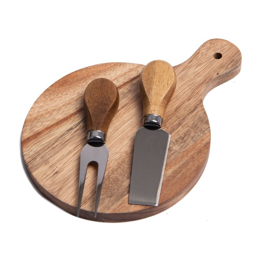Набор для сыра: круглая доска с ручкой и два инструмента в комплекте - нож для мягкого сыра и вилка.