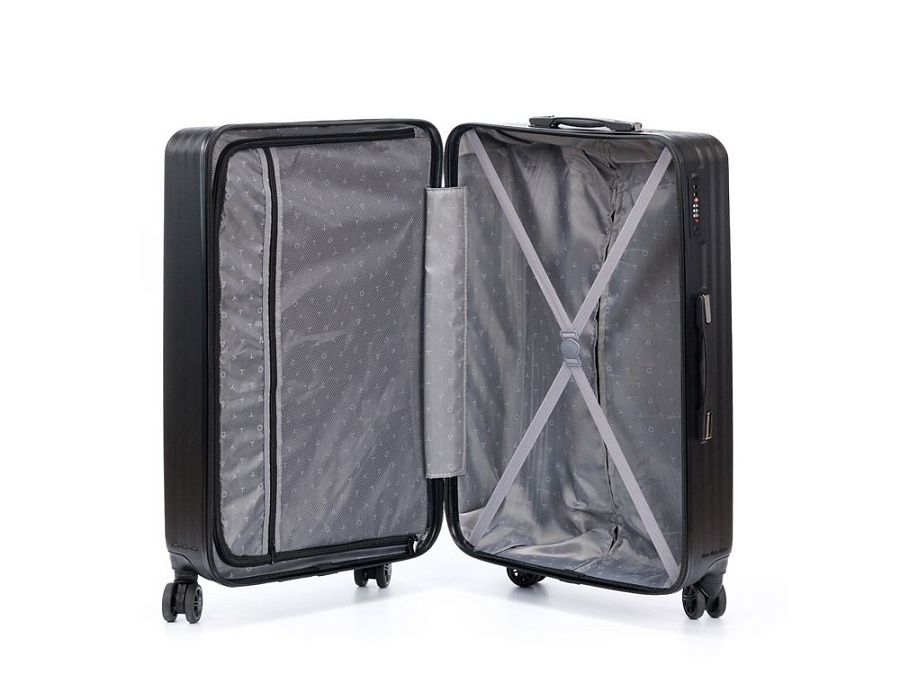 Чемодан полностью раскрывается на 2 вместительных отделения, с перегородкой на молнии и ремнями в форме X для надежной фиксации вещей на месте.