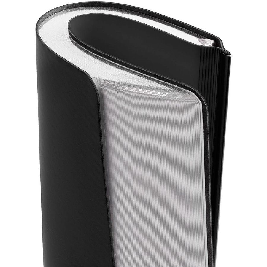 Ежедневник с гибкой обложкой и металлическим корешком, выполнен из материала Soft Touch, черный АА, дополнен серебристым обрезом блока и ляссе.