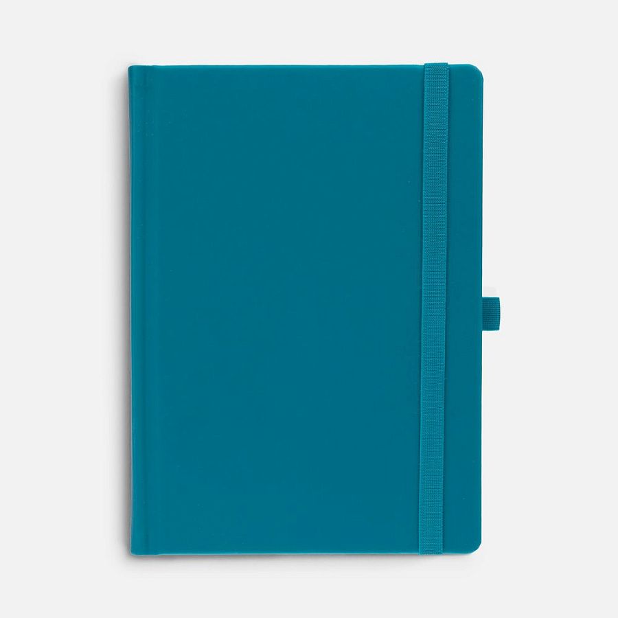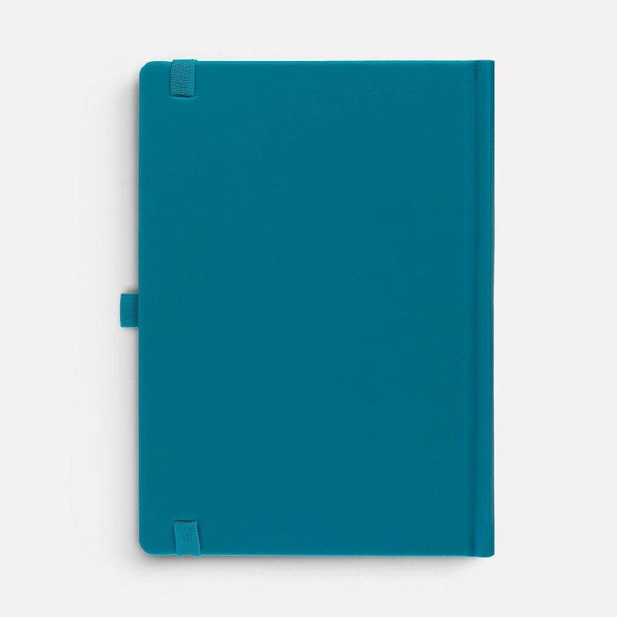 Ежедневник с твердой обложкой без поролона, выполнен из материала Soft Touch, цвет морской волны II, дополнен резинкой шириной 1 см, петлей-резинкой для ручки, капталом и ляссе темно-бирюзового цвета.