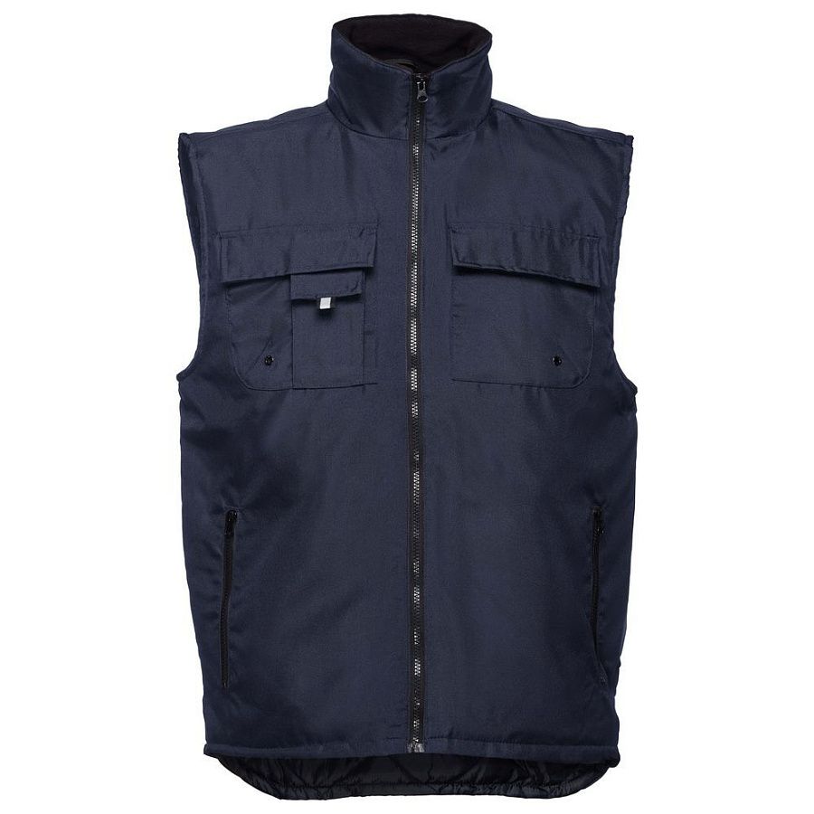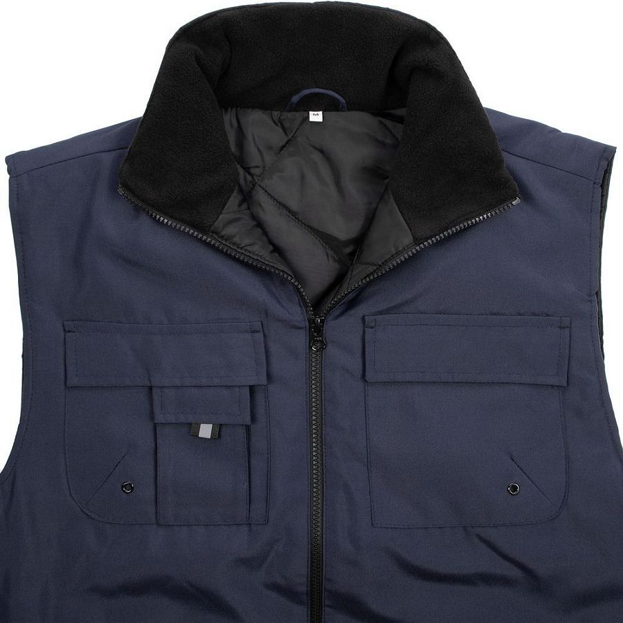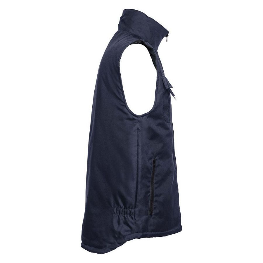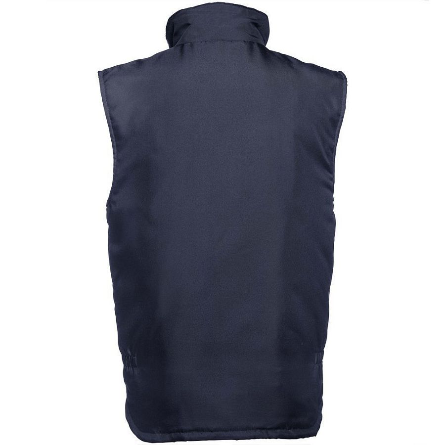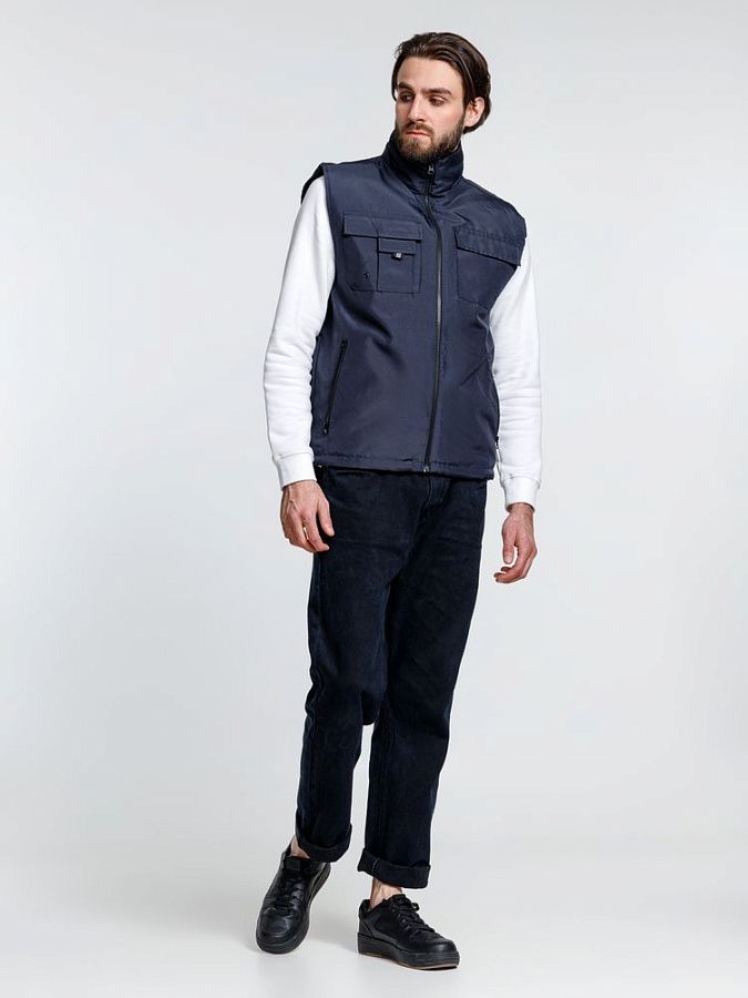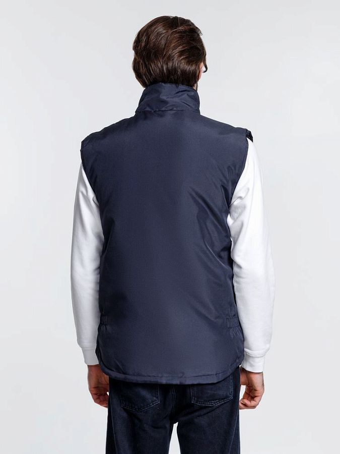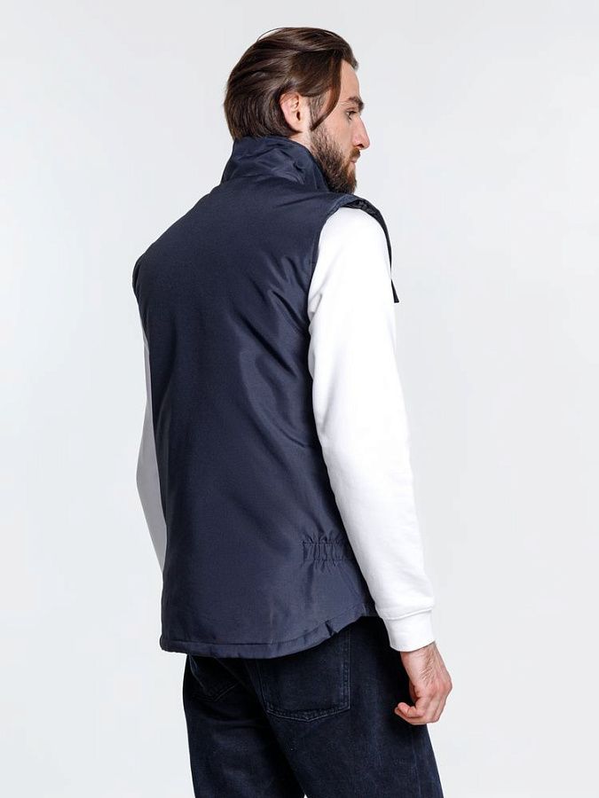 Мужской утепленный жилет с воротником-стойкой и удлиненной спинкой. Выполнен из ткани оксфорд с водоотталкивающим покрытием.