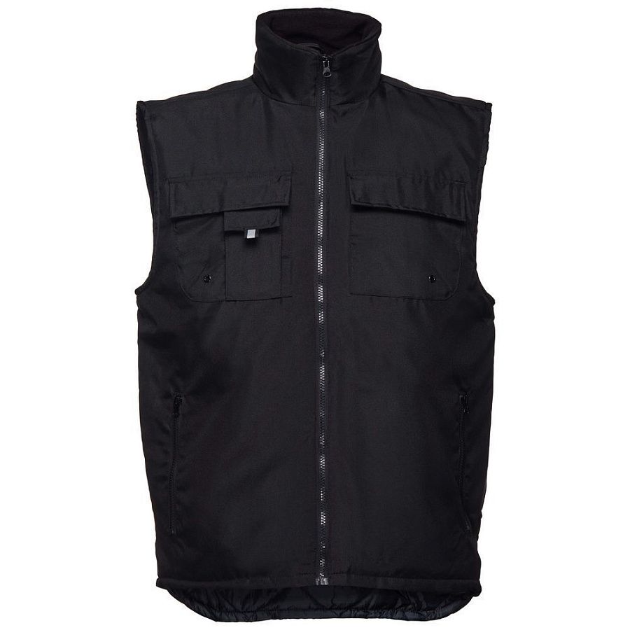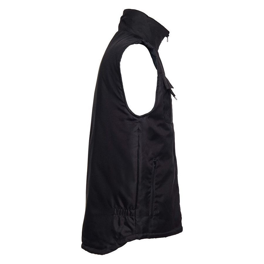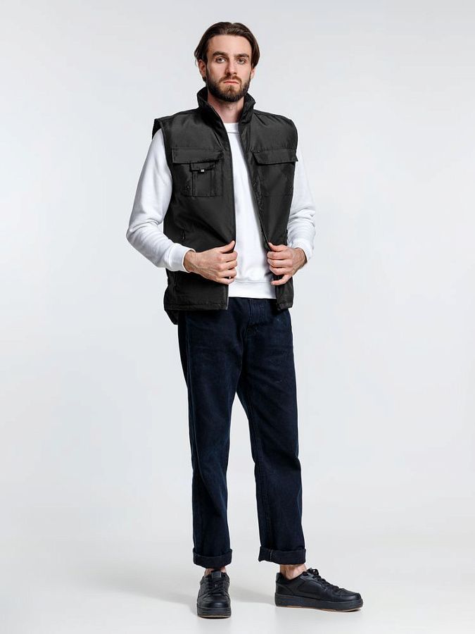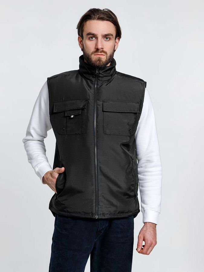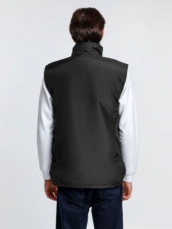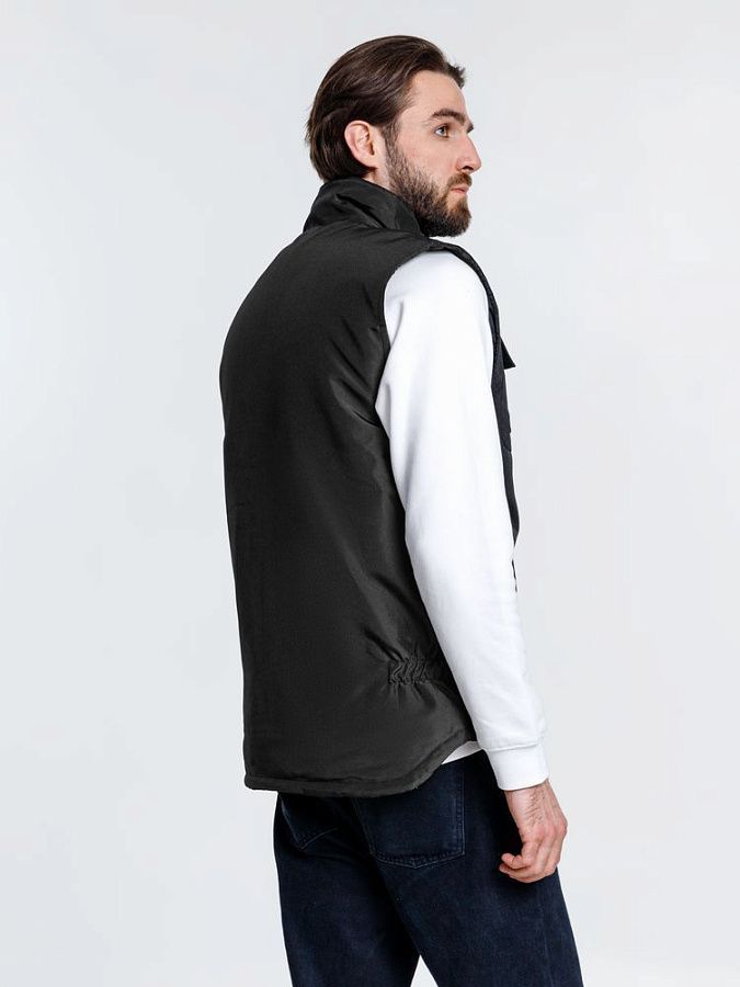 Мужской утепленный жилет с воротником-стойкой и удлиненной спинкой. Выполнен из ткани оксфорд с водоотталкивающим покрытием.