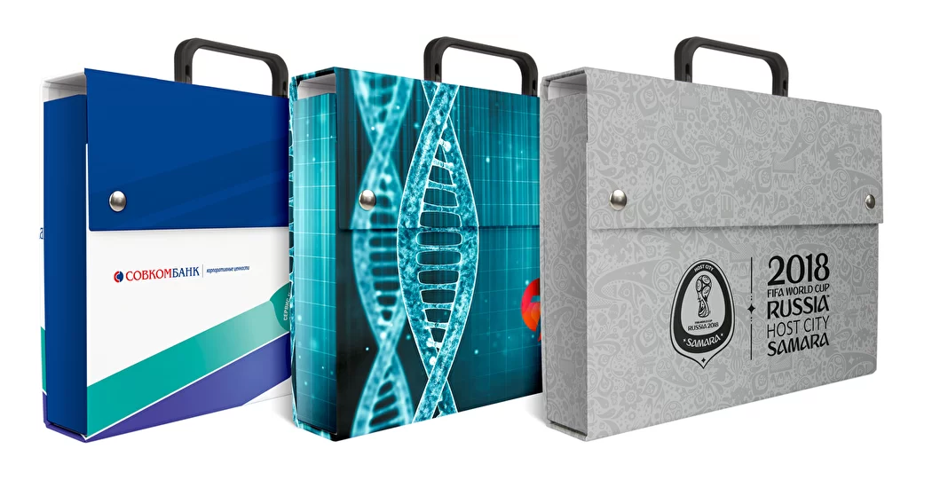 Брендированные портфели с пластиковой ручкой для переноски из кашированного переплётного картона на заказ с кнопками защелками.