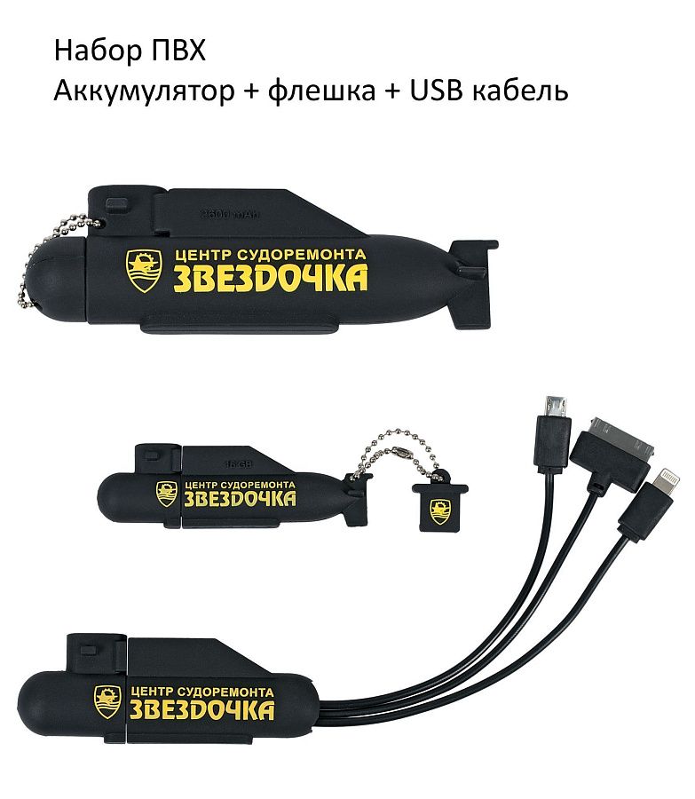 – подарочная коробка (полноцветный шубер) с ложементом для ПВХ аккумулятора, ПВХ флешки, кабеля USB в едином дизайне (см. фото).