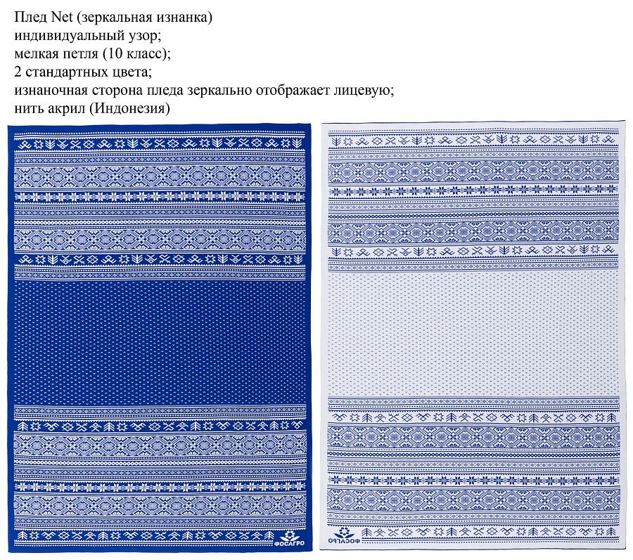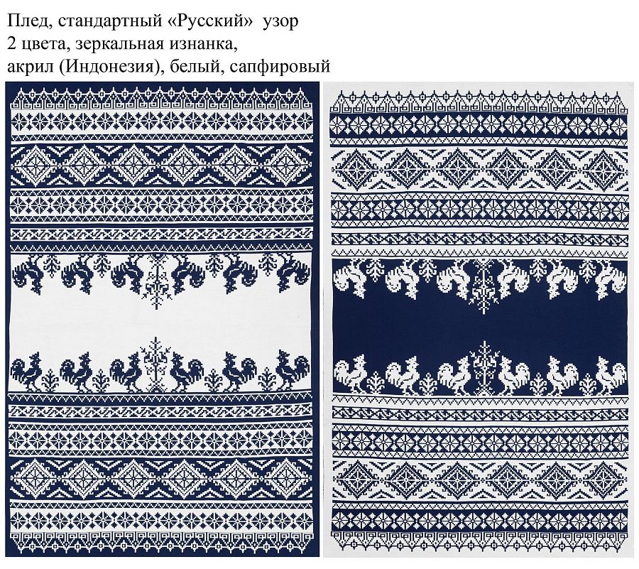 Пледы жаккардовой вязки, 2 и более цветов нитей, гладкая поверхность. Самый популярный вариант — вязание в 2 цвета — позволяет получить на изнанке зеркальное отображение рисунка с лицевой стороны и инверсию цветов.