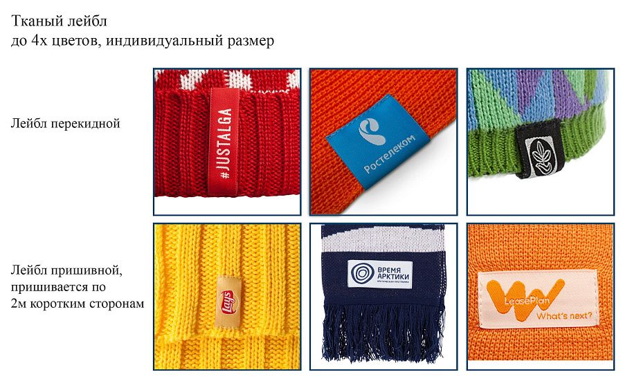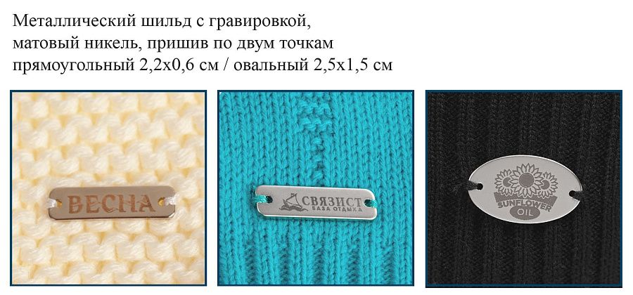 – тканый лейбл (4х2 см), кол-во цветов до 4 / ПВХ лейбл (35х15 мм), кол-во цветов до 3 / кожаный лейбл с блинтовым тиснением, натуральная кожа, пришив по четырем точкам, цвет коричневый/бежевый, размер 40х25 мм / 70х50 мм / 95х43 мм / металлический шильд с гравировкой, овальный / прямоугольный, матовый никель, пришив по двум точкам – макет приложить;