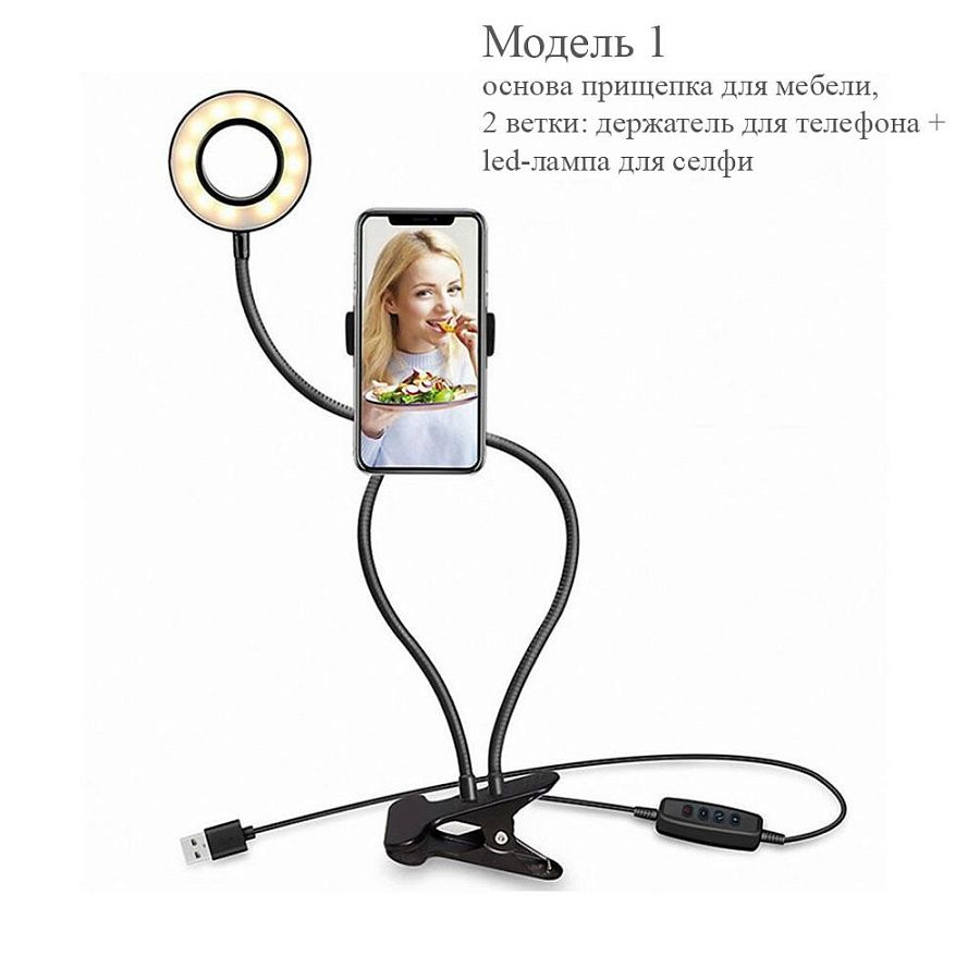 – модель 1 (на прищепке, 2в1: держатель для телефона + led-лампа для селфи/ 2 (на подставке 2в1: держатель для телефона + led-лампа для селфи) / 3 (на подставке, 3в1: держатель для телефона + led-лампа для селфи + держатель для микрофона);