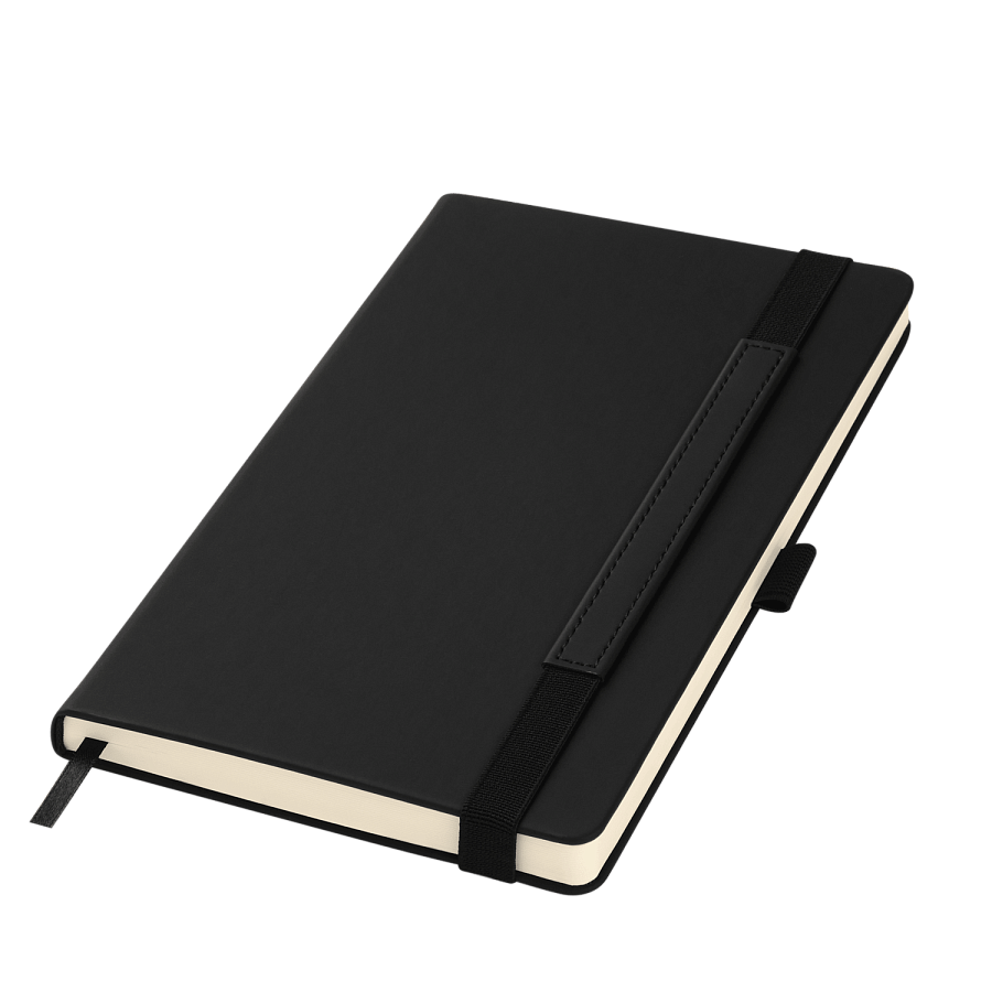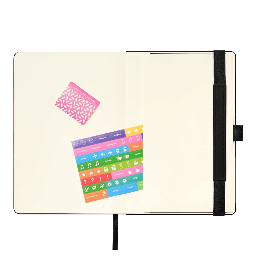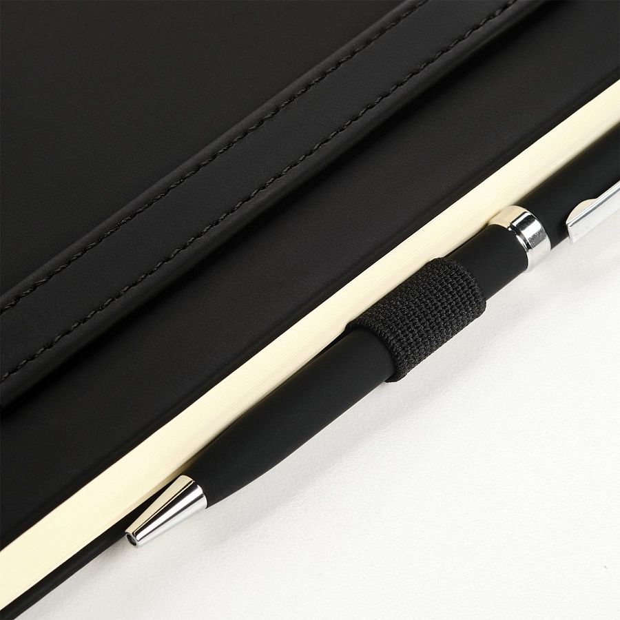 Вертикальная резинка-фиксатор с вставкой из ПУ-материала обложки и петелька под ручку, в цвет обложки