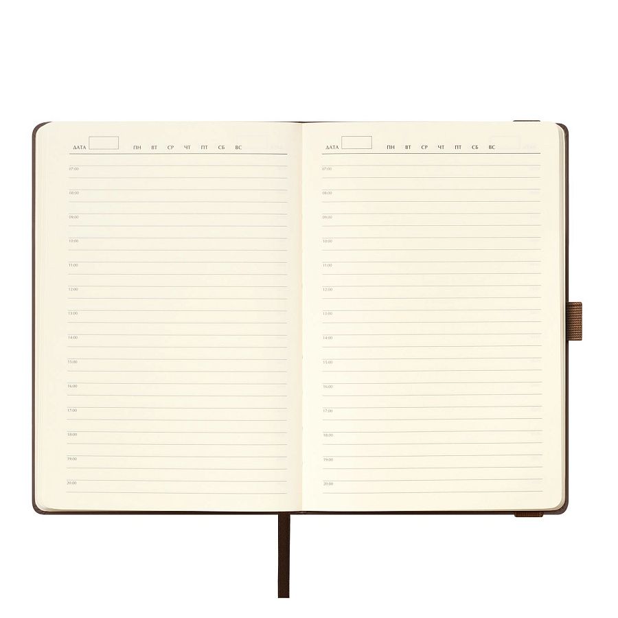 Страницы теплого кремового оттенка с легкой шелковистостью и скругленными уголками радуют глаз и приятны на ощупь. Матовый срез в тон страниц дополняет гармоничный образ. Атласное ляссе, подобранное в тон обложке, с легким блеском и шелковистой текстурой поможет вам быстро найти нужную страницу.
