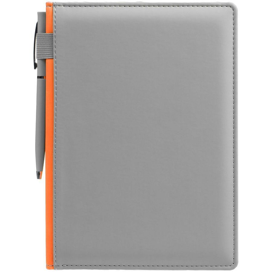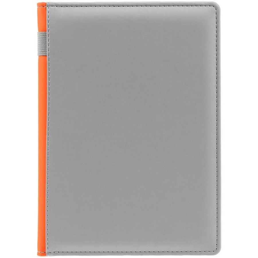 Твердая обложка с поролоном, материал обложки — Soft Touch, серый СС и Soft Touch, оранжевый ОО. На корешке ежедневника находится петля из резинки.