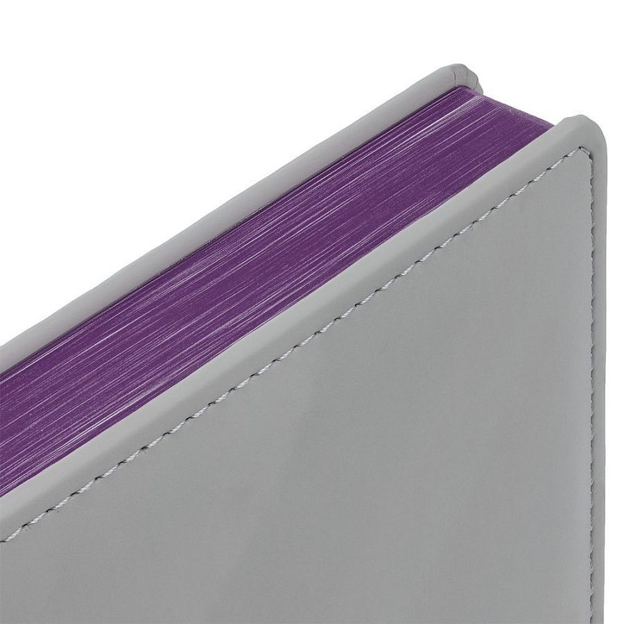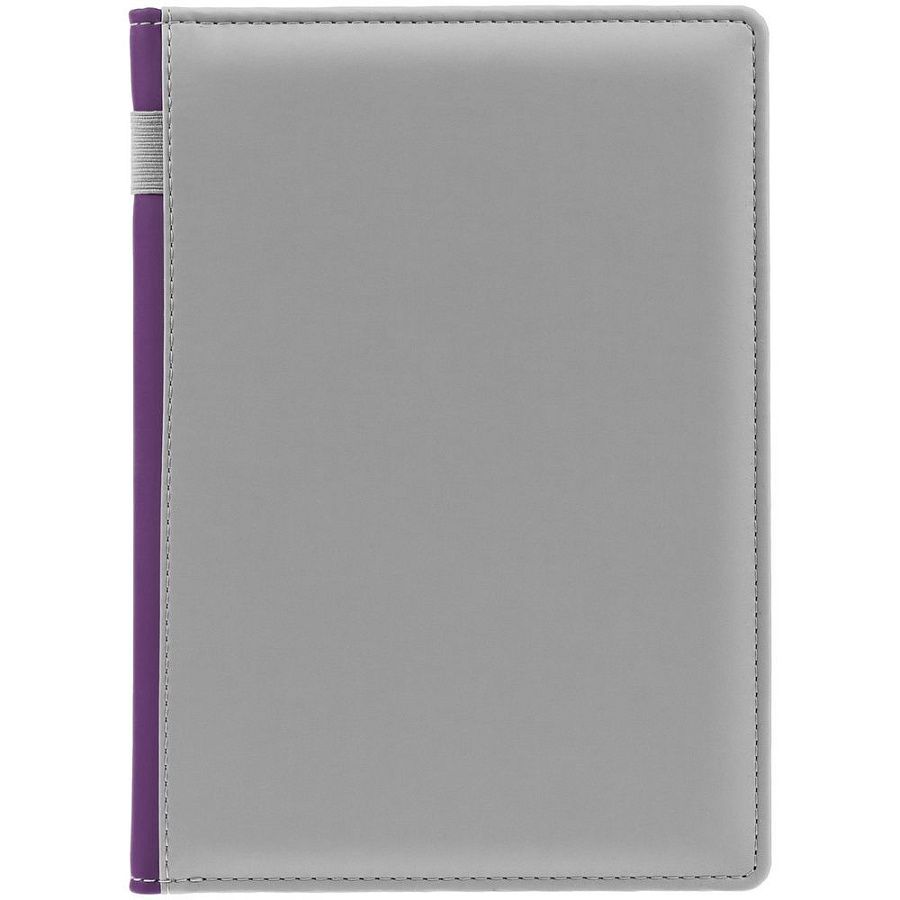 Твердая обложка с поролоном, материал обложки — Soft Touch, серый СС и Soft Touch, фиолетовый UU. На корешке ежедневника находится петля из резинки.