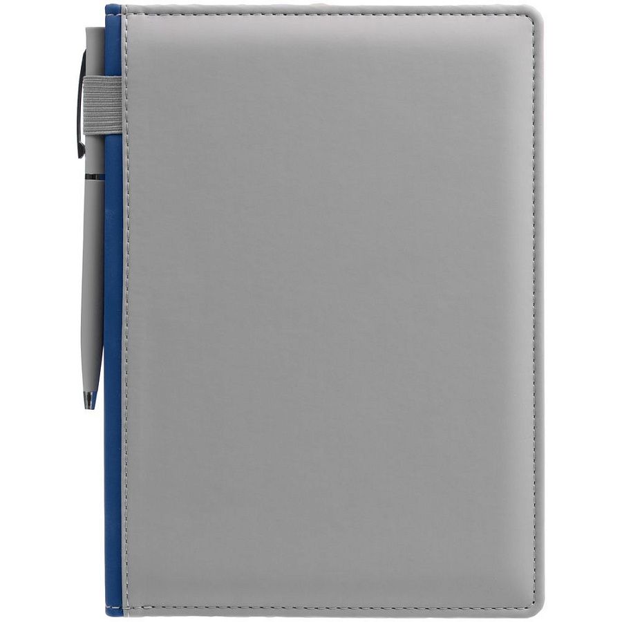 Твердая обложка с поролоном, материал обложки — Soft Touch, серый СС и Soft Touch Ultra, синий НН. На корешке ежедневника находится петля из резинки.