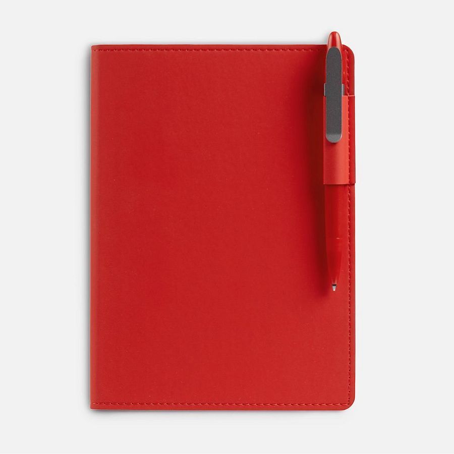 Ежедневник с гибкой обложкой из материала Soft Touch Ultra, красный РР и Latte, красный (внутренний материал), дополнен петелькой для ручки из покровного материала, капталом, ляссе и закрашенным срезом обложки в цвет материала.