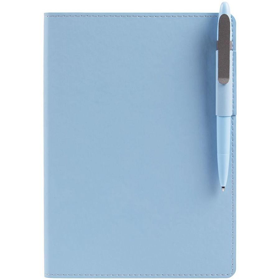 Ежедневник с гибкой обложкой из материала Soft Touch, голубой и Latte, голубой (внутренний материал), дополнен петелькой для ручки из покровного материала, капталом, ляссе и закрашенным срезом обложки в цвет материала.