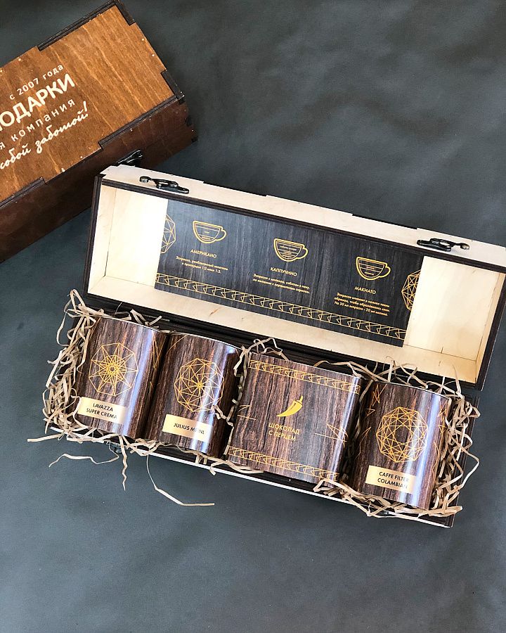 Нанесение (включено в стоимость): гравировка на крышке деревянной шкатулки, открытка с вашим логотипом
