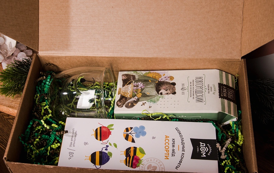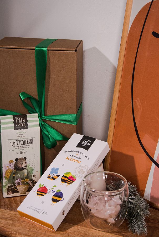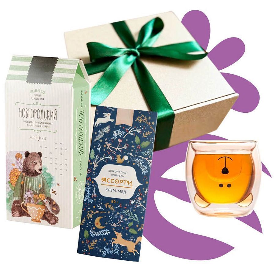 Вкусные и полезные конфеты из натурального мёда обязательно порадуют сладкоежек. Травяной чай — это сбор натуральных листьев с медоносных лугов Новгородской области успокоит и позаботиться об иммунитете в зимний период . Стакан с двойными стенками в форме медведя станет любимым атрибутом на столе.