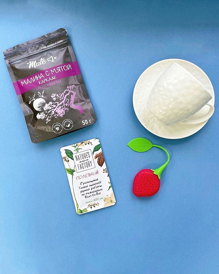 Пример, когда классический чайный набор можно представить в современном формате. Модный и полезный гречишный шоколад, малиново-мятный каркаде и клубничное ситечко в чайной паре из костяного фарфора.