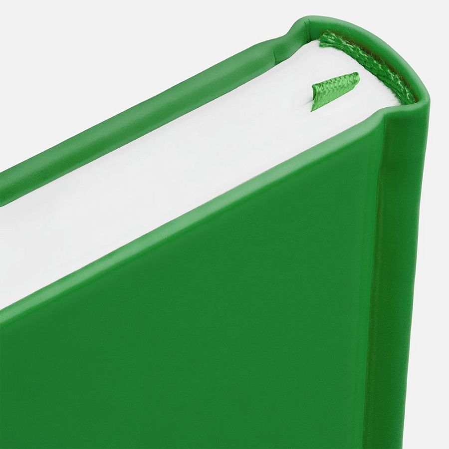 Ежедневник с твердой обложкой без поролона, выполнен из материала Soft Touch Ultra, зеленый FF, дополнен резинкой шириной 1 см, петлей-резинкой для ручки, капталом и ляссе ярко-зеленого цвета.