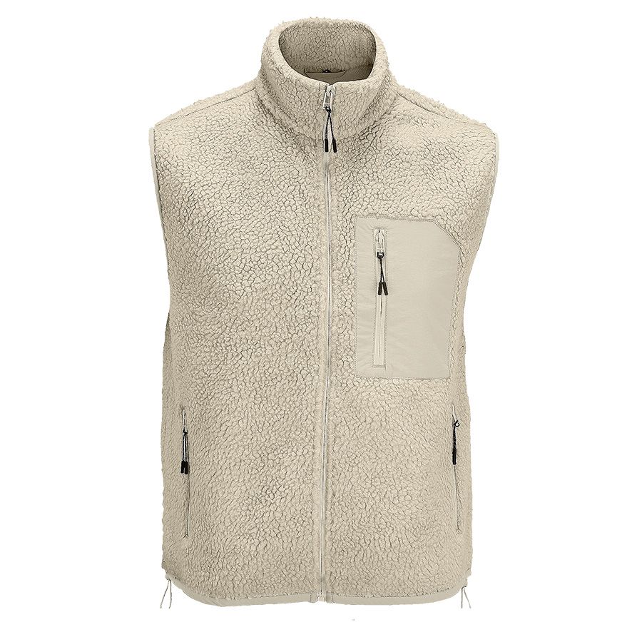 Жилет унисекс из искусственного меха шерпа с карманами на молнии: 1 нагрудным из таслана для нанесения логотипа и 2 боковыми. Черные пуллеры на молниях со светоотражающими элементами.