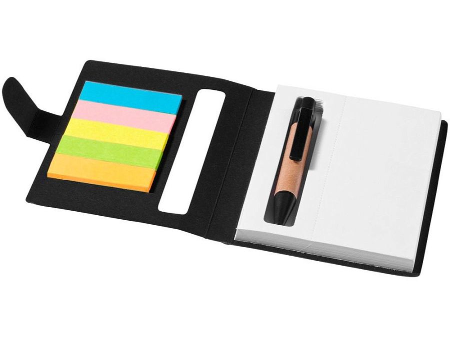 Набор цветных стикеров с шариковой ручкой и блоком из 80 белых отрывных листков. Очень удобный и функциональный аксессуар для офиса, а также отличный промо-сувенир. На обложку из уплотненного картона возможно нанесение логотипа вашей компании.