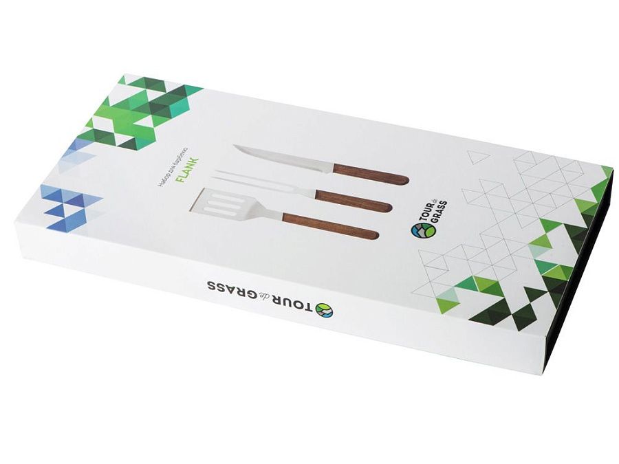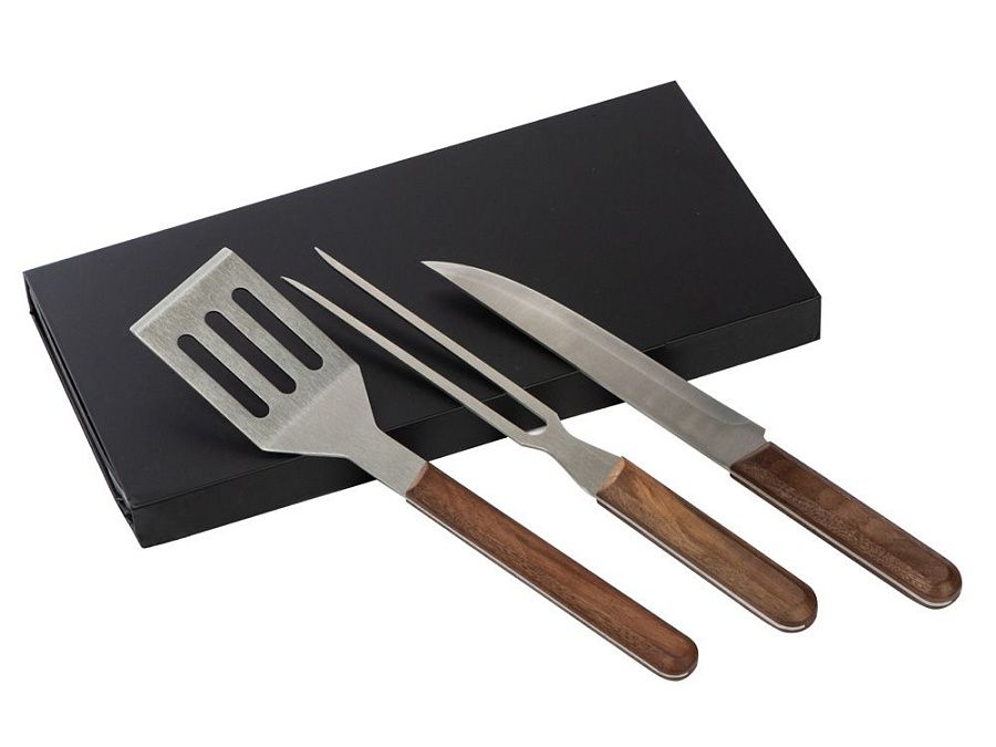 Набор для барбекю от Tour de Grass состоит из лопатки, вилки и ножа с ореховыми ручками. Все три приспособления для готовки — изящные, функциональные, прекрасно подойдут для подарка, а футляр на магните, идущий в комплекте, решит вопрос упаковки.