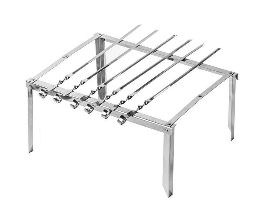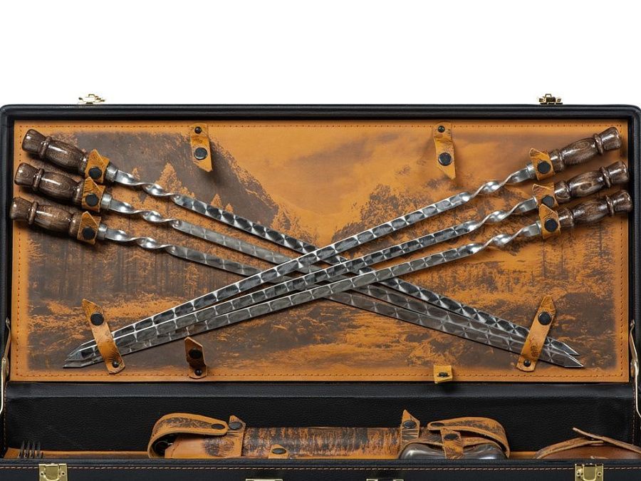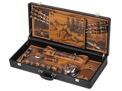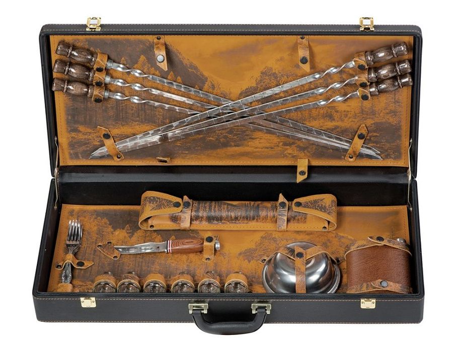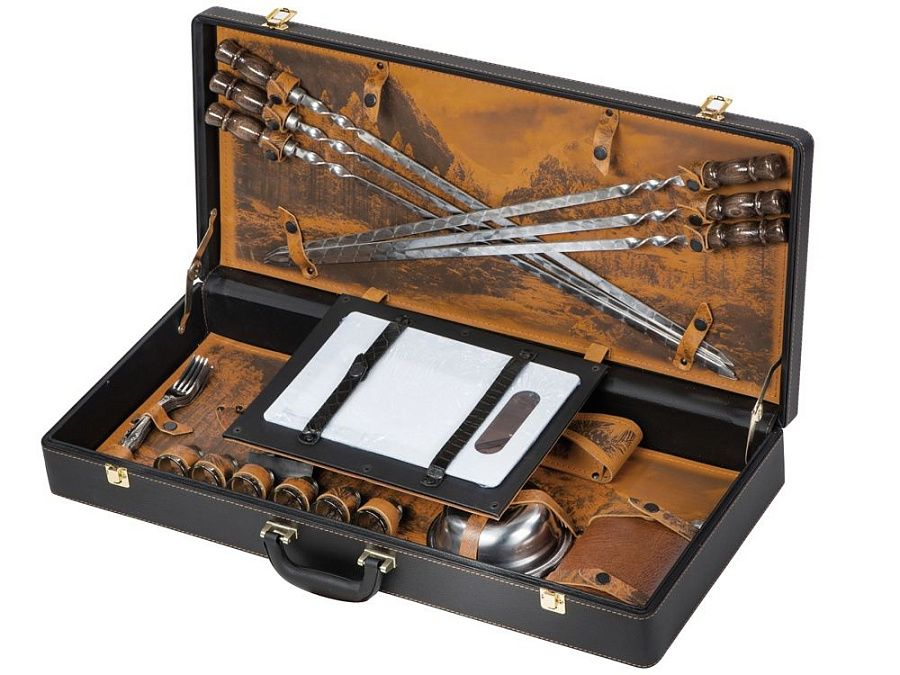 шампура большие- 6 шт, доска разделочная, вилка- 6 шт, нож, стопка- 6 шт, тарелка- 6 шт, фляга, шампура маленькие- 6 шт, мангал