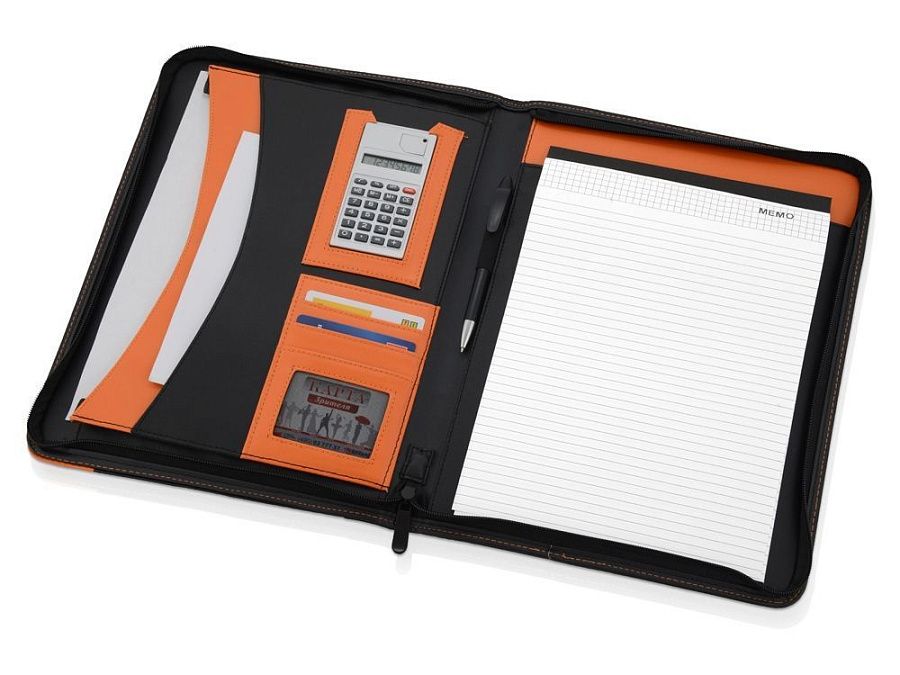 Стильная папка для документов Gabin – прекрасный подарок для делового человека. Папка формата А4 со сменным блокнотом и встроенным калькулятором. Сделана из искусственной кожи, особенно стильный вид ей придает цветная отделка внутри и снаружи. На металлический шильд можно нанести гравировку.
