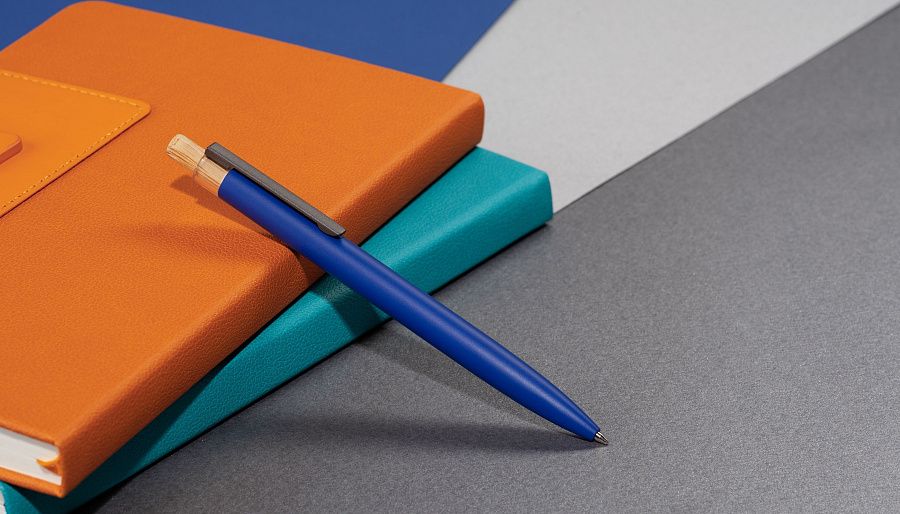 Трендовая эко-ручка, изготовленная из переработанных алюминия и пластика, с кнопкой из бамбука.