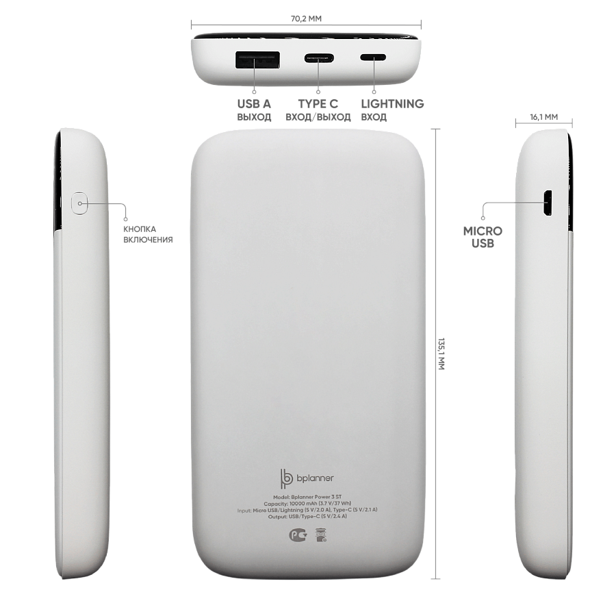 Внешний софт-тач аккумулятор Bplanner Power 3ST емкостью 10000 mAh оснащен цифровым индикатором заряда. Дизайн аккумулятора дополняет черный дисплей заряда на передней панели устройства. Внешний аккумулятор оснащен входом Type С, Micro-USB и Lightning, что упрощает процесс его зарядки. В комплекте идет кабель 3 в 1 и инструкция. Комбинируется с ежедневниками Bplanner 1, Bplanner 2, Bplanner 4 ,а также ручками с софт-тач покрытием.