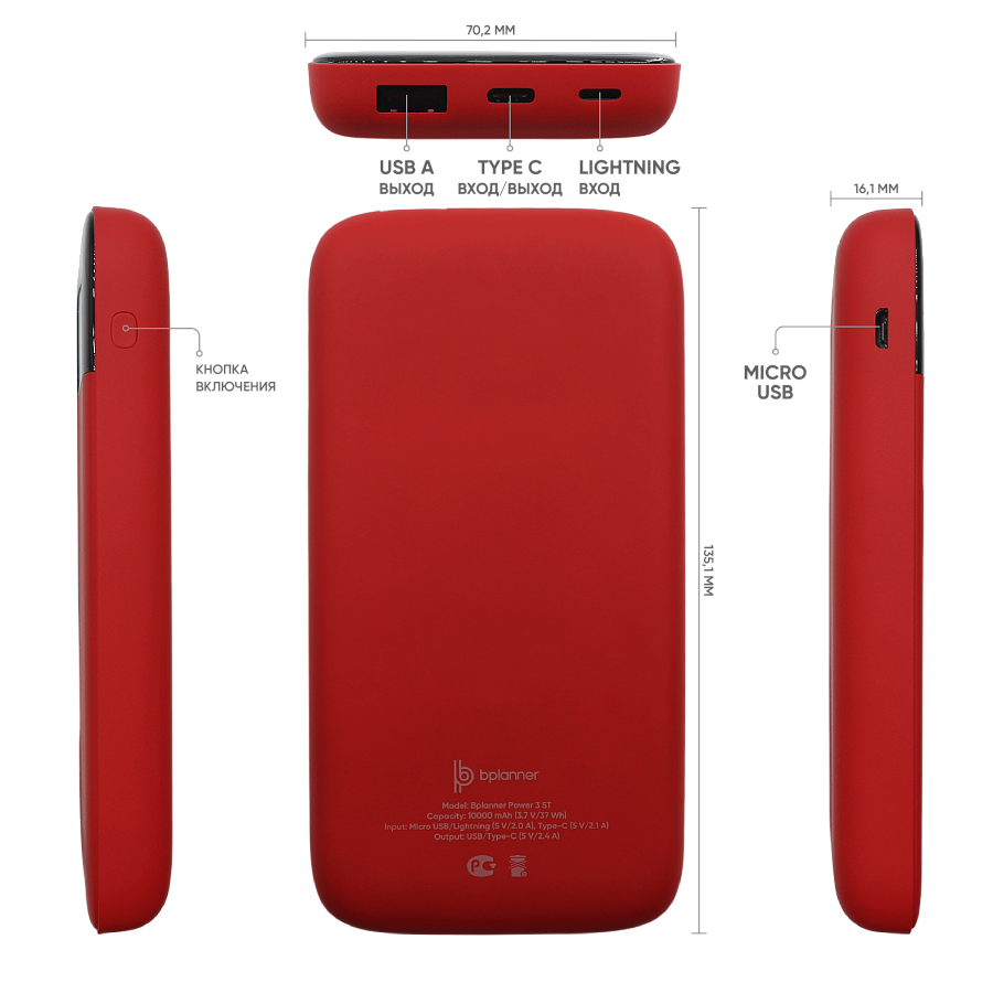 Внешний софт-тач аккумулятор Bplanner Power 3ST емкостью 10000 mAh оснащен цифровым индикатором заряда. Дизайн аккумулятора дополняет черный дисплей заряда на передней панели устройства. Внешний аккумулятор оснащен входом Type С, Micro-USB и Lightning, что упрощает процесс его зарядки. В комплекте идет кабель 3 в 1 и инструкция. Комбинируется с ежедневниками Bplanner 1, Bplanner 2, Bplanner 4 ,а также ручками с софт-тач покрытием.