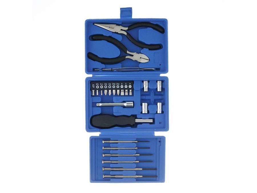 Набор инструментов на 25 предметов STINGER W0414 поставляется в необычном трёхстворчатом пластиковом кейсе насыщенного синего цвета. Входящие в комплект инструменты позволят без труда решать самые разные задачи по ремонту в доме или починке техники. Все инструменты изготовлены из высококачественной закаленной углеродистой стали с хромированным покрытием, рукоятки выполнены из углепластика чёрного цвета. Этот материал не скользит и гарантирует удобное положение в руке.