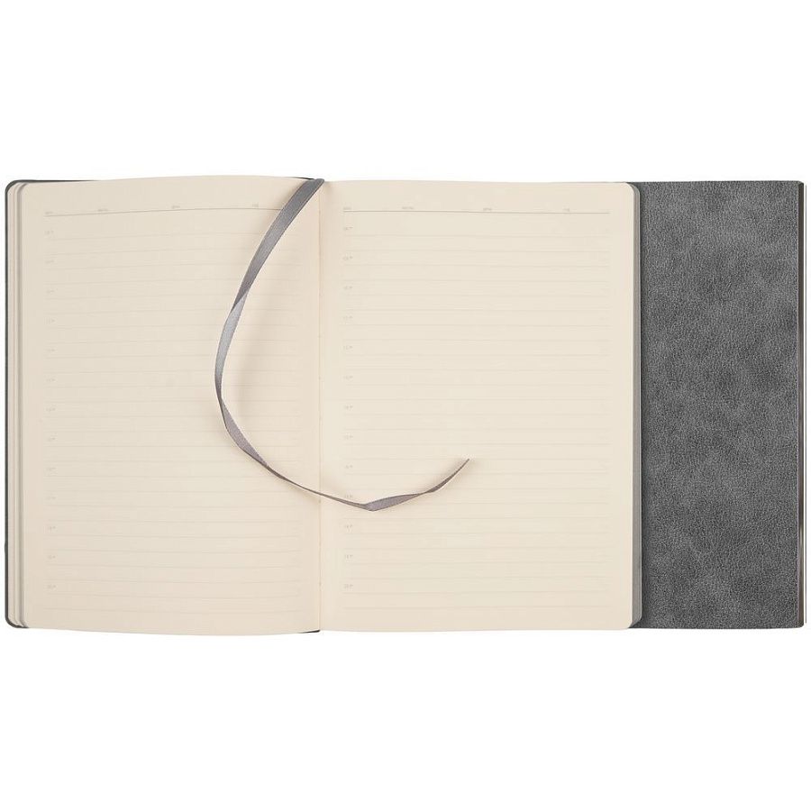 Ежедневник с гибкой обложкой, клапаном на магните и металлической отделкой клапана. Выполнен из материала Petrus, серый СС, дополнен серым ляссе.