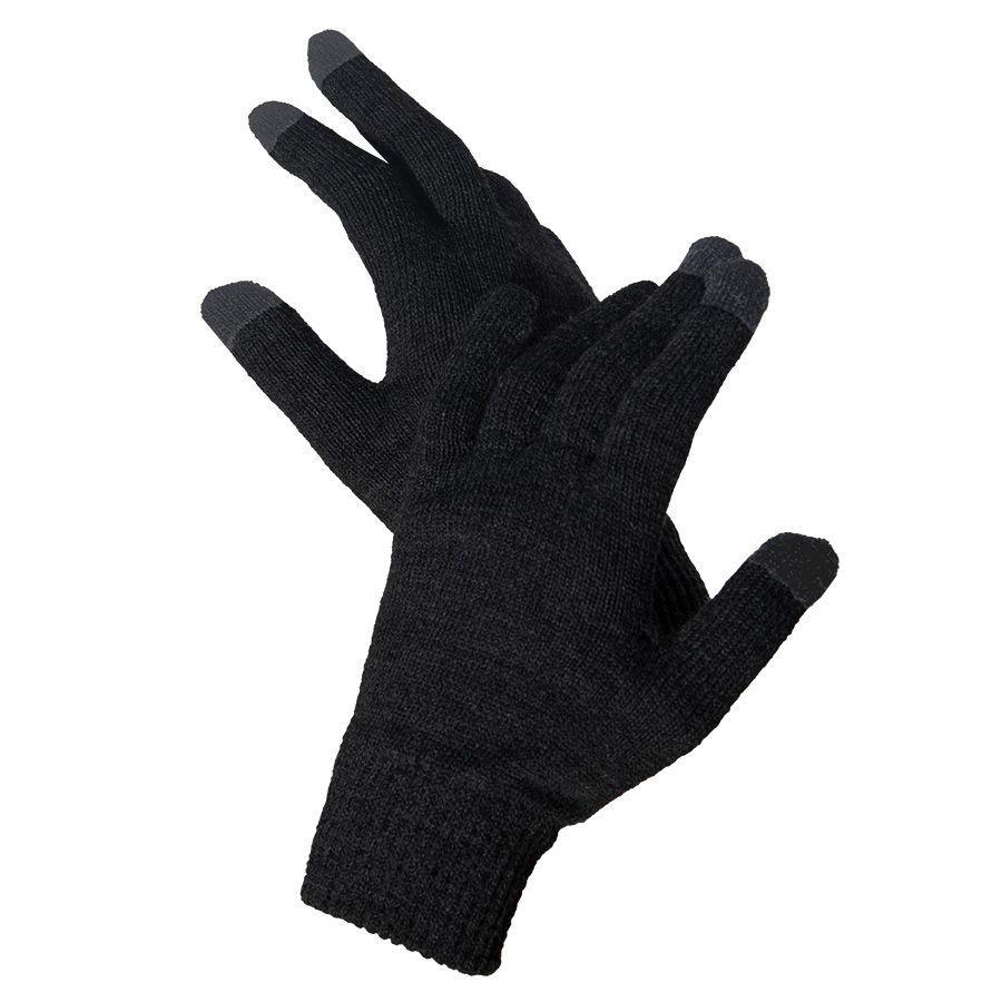 Перчатки из теплого и мягкого акрила с сенсорными наконечниками. Основной цвет: черный. Цвет сенсорных вставок: серый меланж.