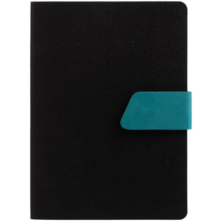 Ежедневник с гибкой обложкой, выполнен из материала La Fite, черный АА и Nubuck, цвет морской волны II, дополнен бирюзовым ляссе и хлястиком на кнопке.