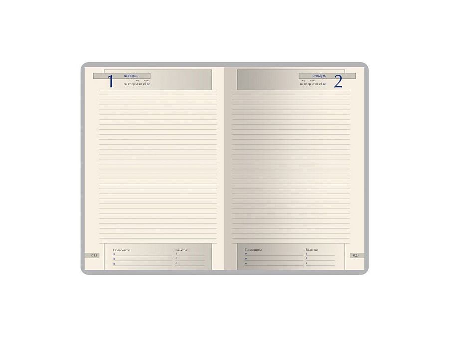 • удобно организованный полудатированный блок из бежевой бумаги плотностью 70 г/кв.м, с линовкой серого цвета;