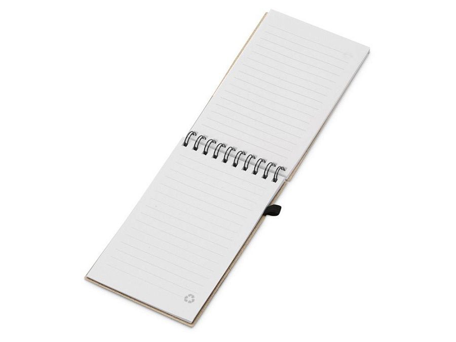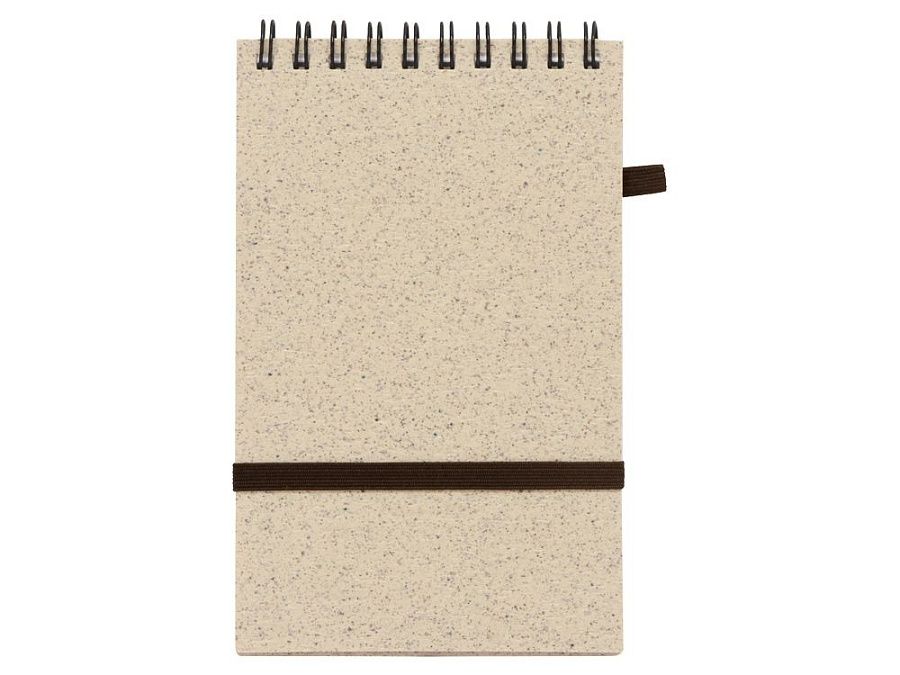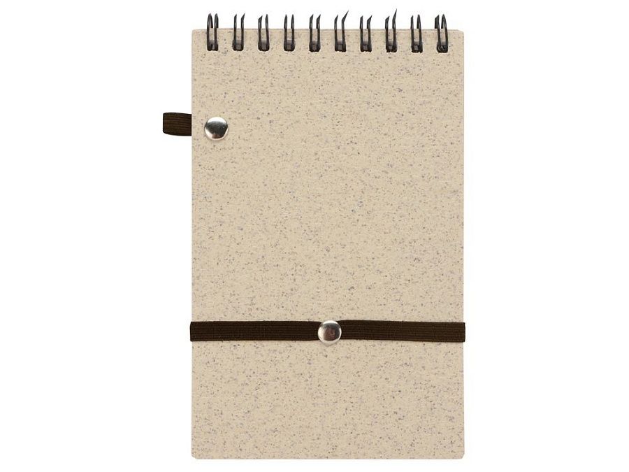 Блокнот с обложкой из переработанной пшеницы и пластика. Блок состоит из 60 листов переработанной бумаги белого цвета. Крепление - пружина. Дополнен петлей для ручки и горизонтальной резинкой.
