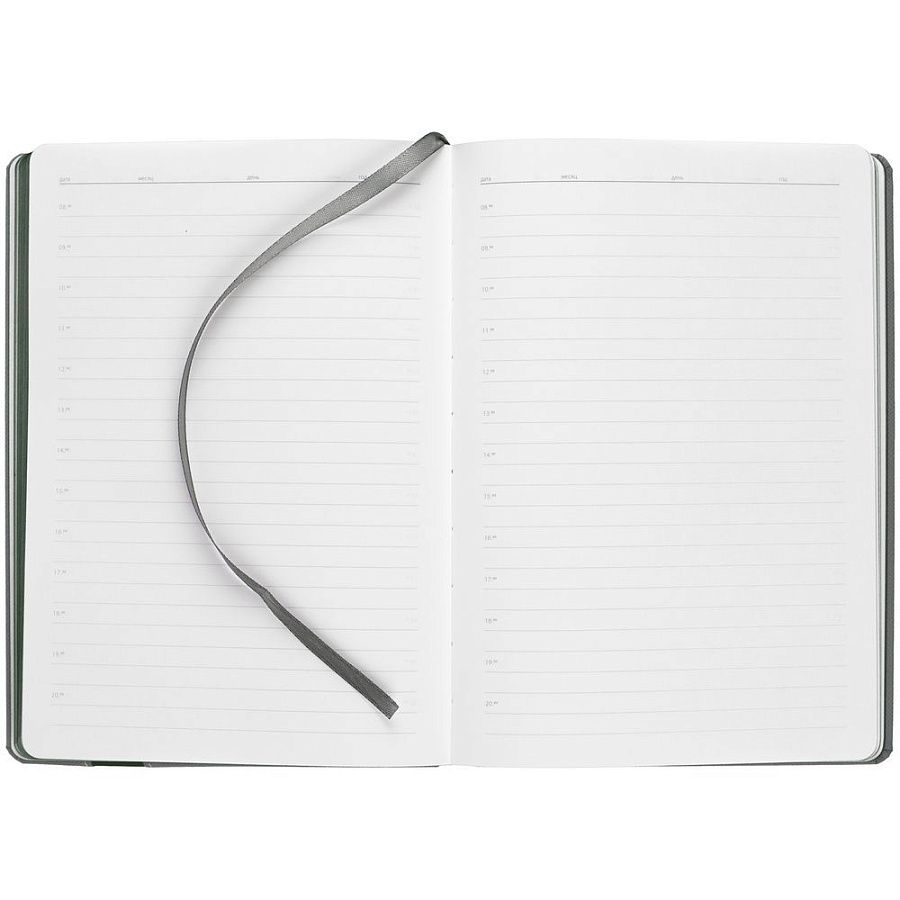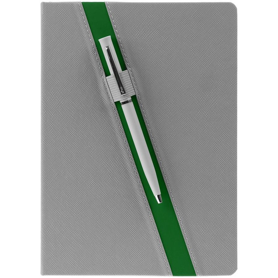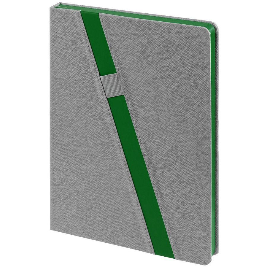 Ежедневник с твердой обложкой и тонированным обрезом. Выполнен из материала Nice Touch, серый СС, и Soft Touch Ultra, зеленый FF, дополнен серым ляссе.