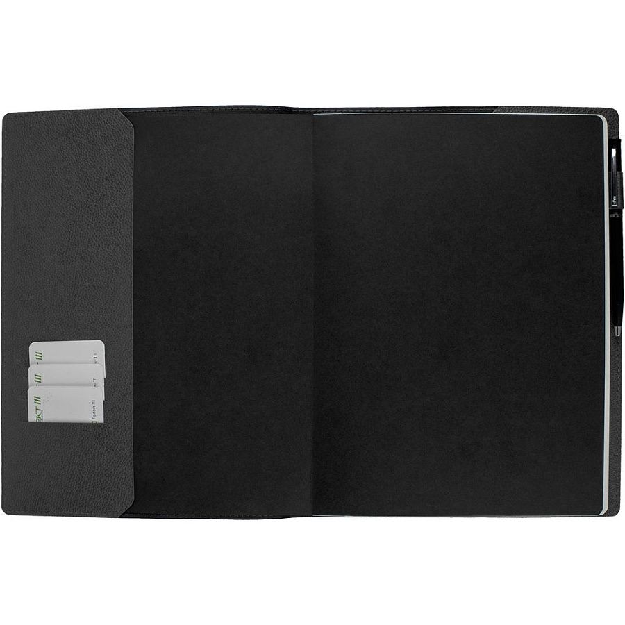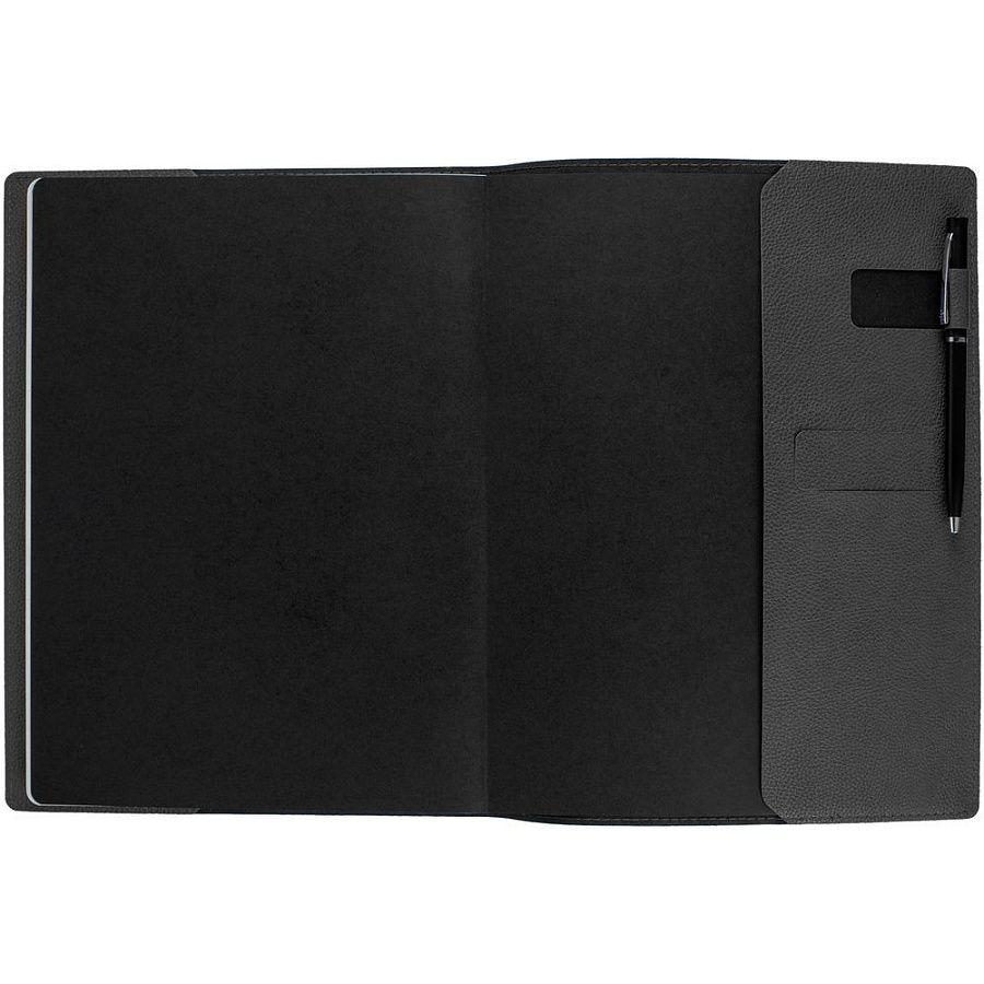 Ежедневник в суперобложке выполнен из материала La Fite, темно-серый EE, дополнен ляссе и капталом черного цвета.