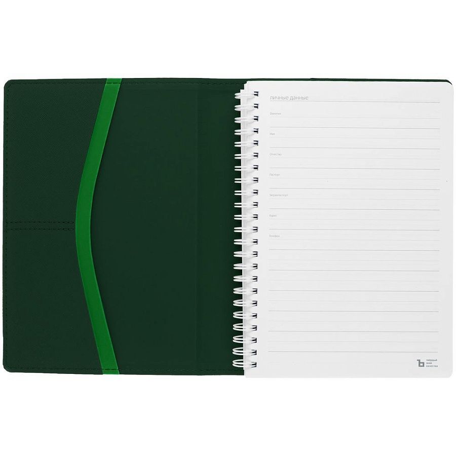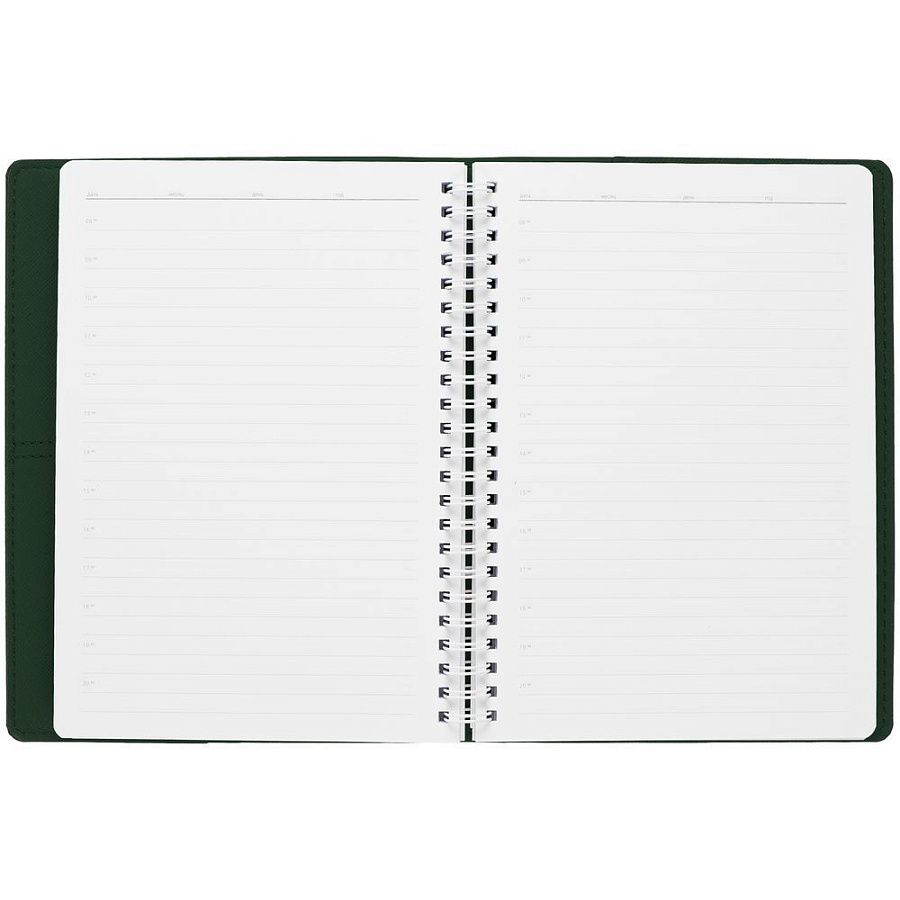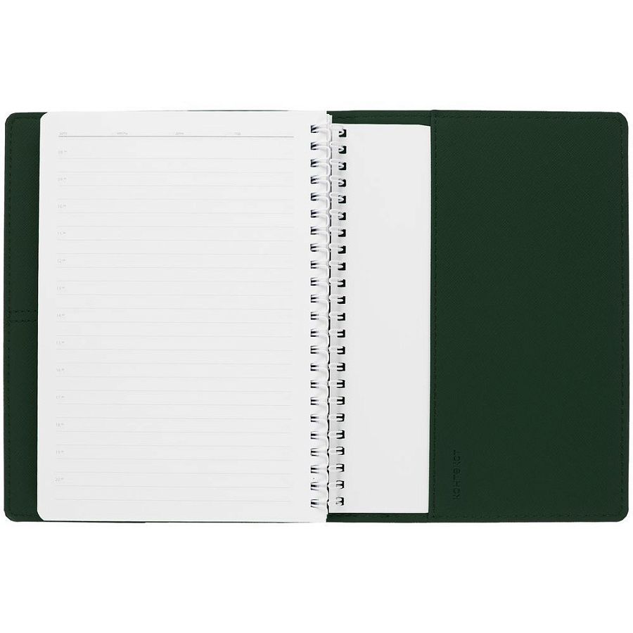 Ежедневник с блоком на пружине в твердой обложке, выполнен из материалов Nice Touch, Soft Touch и Soft Touch Ultra зеленый.