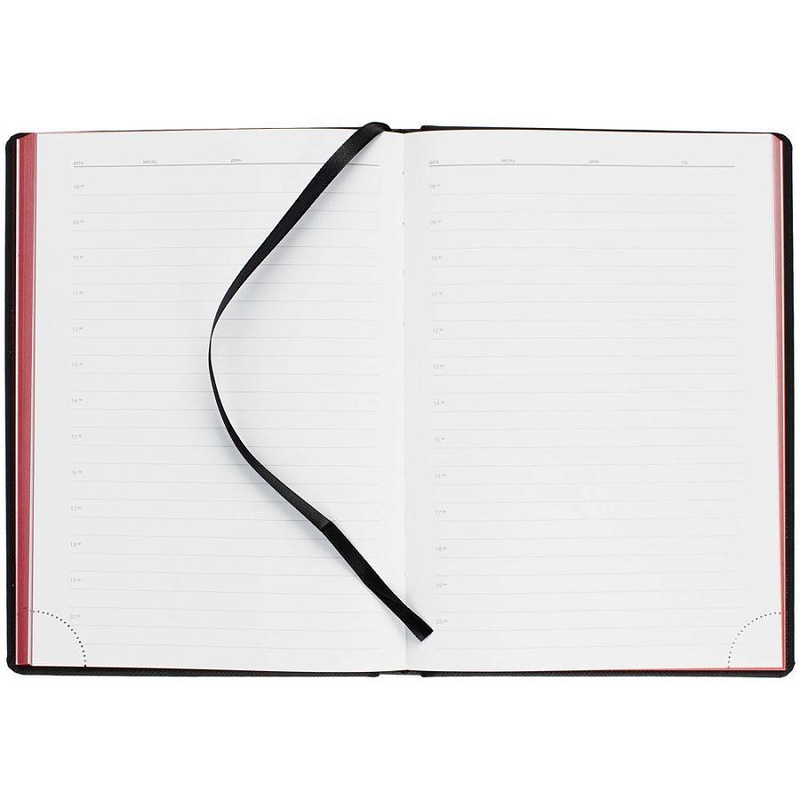 Твердая обложка выполнена из материалов Nice Touch, черный АА, и Canyon, красный РР. Ежедневник дополнен капталом, резинкой для ручки и ляссе черного цвета.